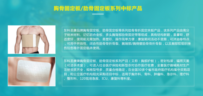 東科圣康牌胸骨固定板、肋骨固定板系列產(chǎn)品(又稱:胸部護(hù)板),密封包裝,輻照滅菌(可進(jìn)手術(shù)室),可進(jìn)入社會(huì)醫(yī)療保險(xiǎn)和新型農(nóng)村合作醫(yī)療收費(fèi),全套醫(yī)療器械耗材生產(chǎn)注冊(cè)資質(zhì)齊全,規(guī)格型號(hào)多,質(zhì)量合格穩(wěn)定,在全國30多個(gè)省市政府醫(yī)療機(jī)構(gòu)集中采購項(xiàng)目,和公立醫(yī)療機(jī)構(gòu)陽光采購項(xiàng)目中標(biāo),適用于胸外科、骨科、腫瘤科、急診科、理療科、整形科、120現(xiàn)場(chǎng)急救、ICU、康復(fù)科等科室。