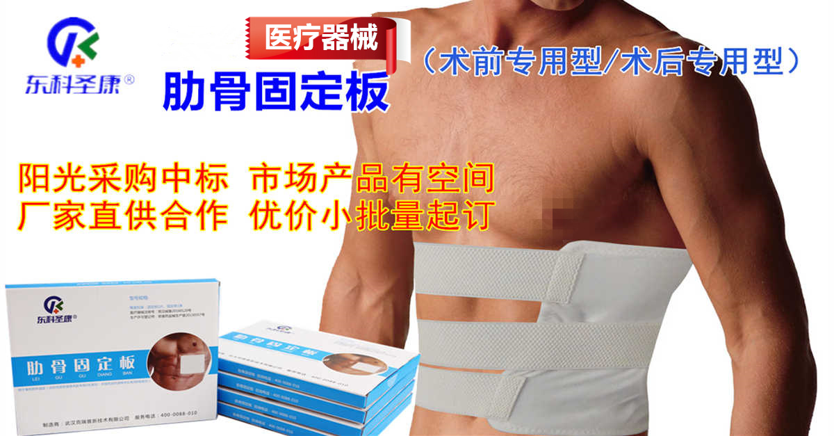 東科圣康品牌肋骨固定板(胸骨固定板)系列產(chǎn)品,分為術前A型、術后B型兩大類,生產(chǎn)廠家武漢克瑞普直接供貨合作,產(chǎn)品由醫(yī)用高分子材料、記憶金屬鋁合金板、多頭胸背部肋骨固定帶等組成,具有多層結構,重量輕,體驗度好,使用前無需加熱,操作簡單方便(有產(chǎn)品操作使用視頻)等特點,可用于開放性、閉合性肋骨骨折、胸背部/胸側壁肋骨損傷,以及胸部軟組織挫傷的外固定,產(chǎn)品用手依身體患部曲線塑形,與身體的合體性較好,固定剛性符合臨床要求;產(chǎn)品表面采用低敏性材料,具有透氣性和防水性,使用期間可沐浴,可拍X光復檢。