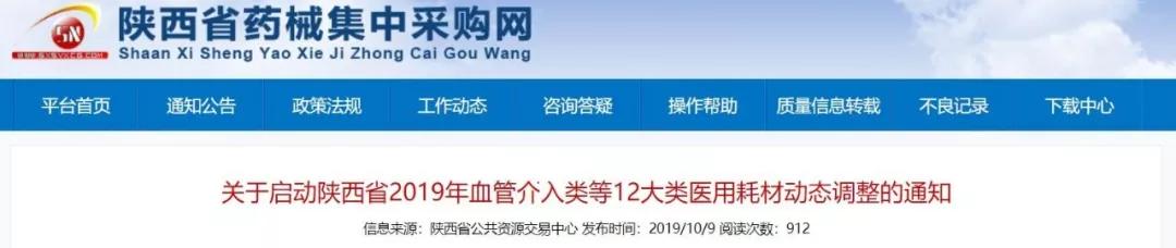10月9日,陜西省藥械集中采購(gòu)網(wǎng)發(fā)布《關(guān)于啟動(dòng)陜西省2019年血管介入類等12大類醫(yī)用耗材動(dòng)態(tài)調(diào)整的通知》(下稱《通知》)。