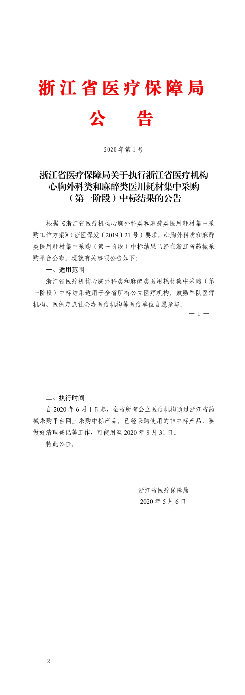 《關(guān)于執(zhí)行浙江省醫(yī)療機(jī)構(gòu)心胸外科類和麻醉類醫(yī)用耗材集中采購(第一階段)中標(biāo)結(jié)果的公告》